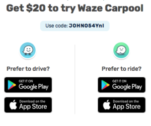 Get $20 to Try Waze Carpool: Use Promo Code JOHNO54YnI to get a $20 Waze Carpool Bonus for new riders or drivers when you join Waze Carpool.